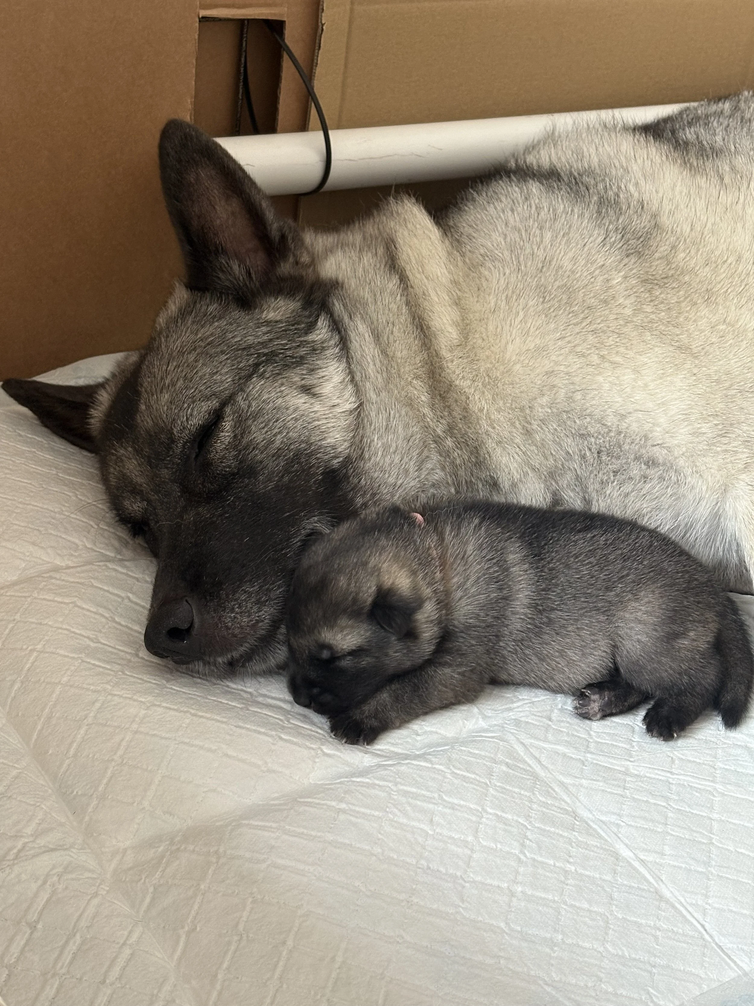 Wednesday 27 August 2025 saw the safe arrival of the latest Treskha Elkhounds. After a heartbreaking miscarriage last year, we wanted to wait until the puppies were safely here before making this announcement.