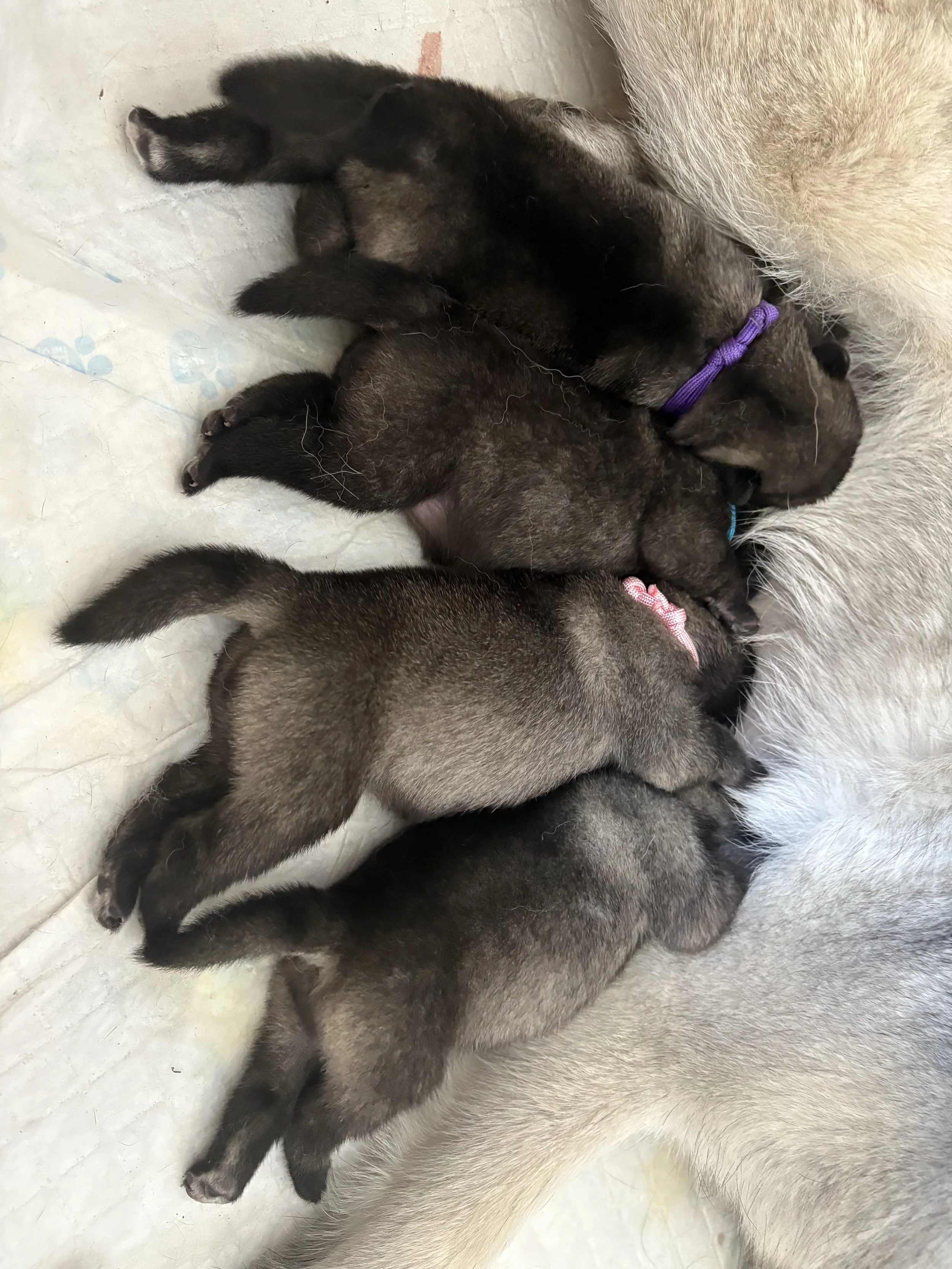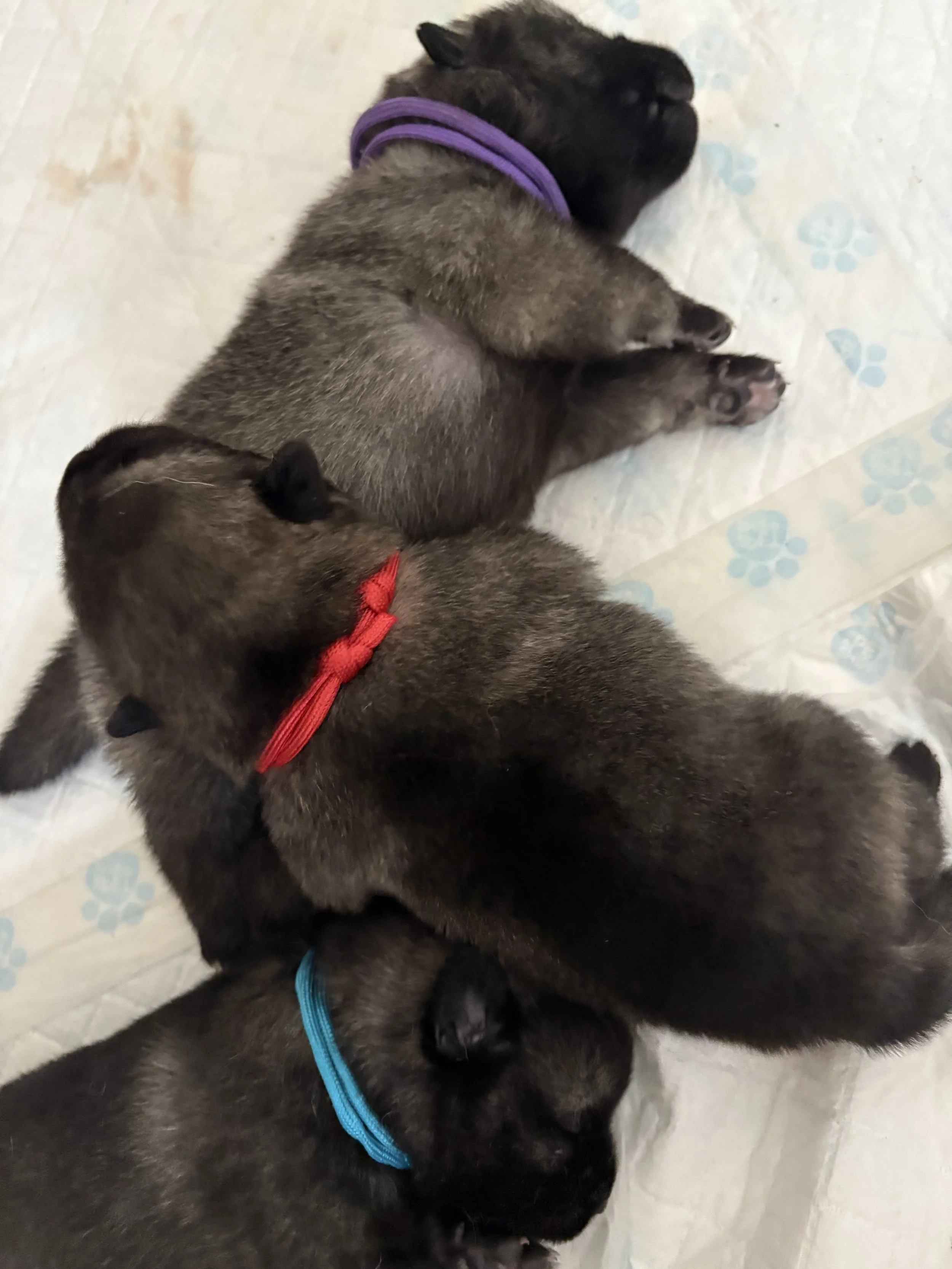 Wednesday 27th August 2025 saw the safe arrival of the newest Treskha Elkhounds. After a heartbreaking miscarriage last year, we have waited until the puppies have safely arrived before making this announcement.